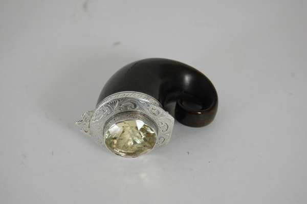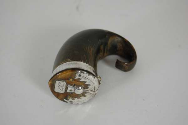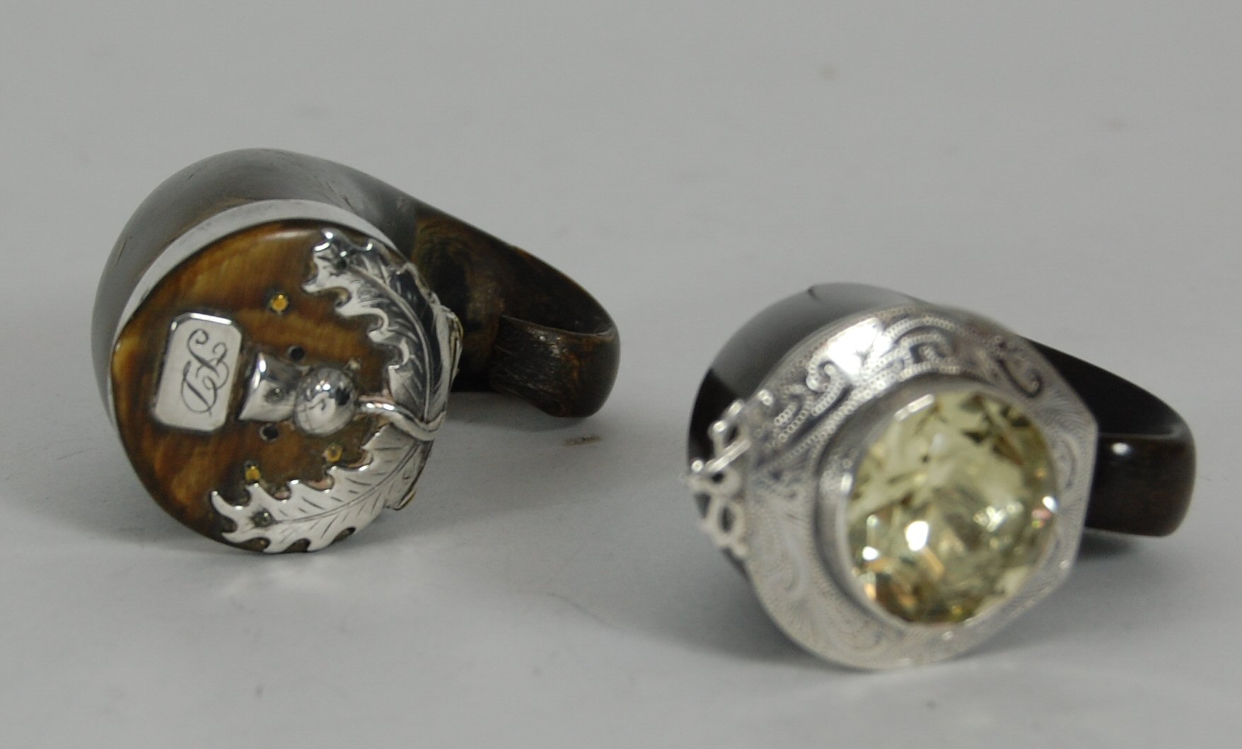 one with simple collar mount with horn cover with thistle hinge and applied plaque with engraved initials 'JD'; together with an example with engraved collar 'JOs Hayton Blackclock 1832 - 1888', the hinged cover set with circular cut citrine and engraved scrolling border (2)