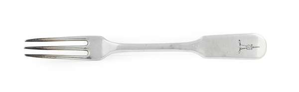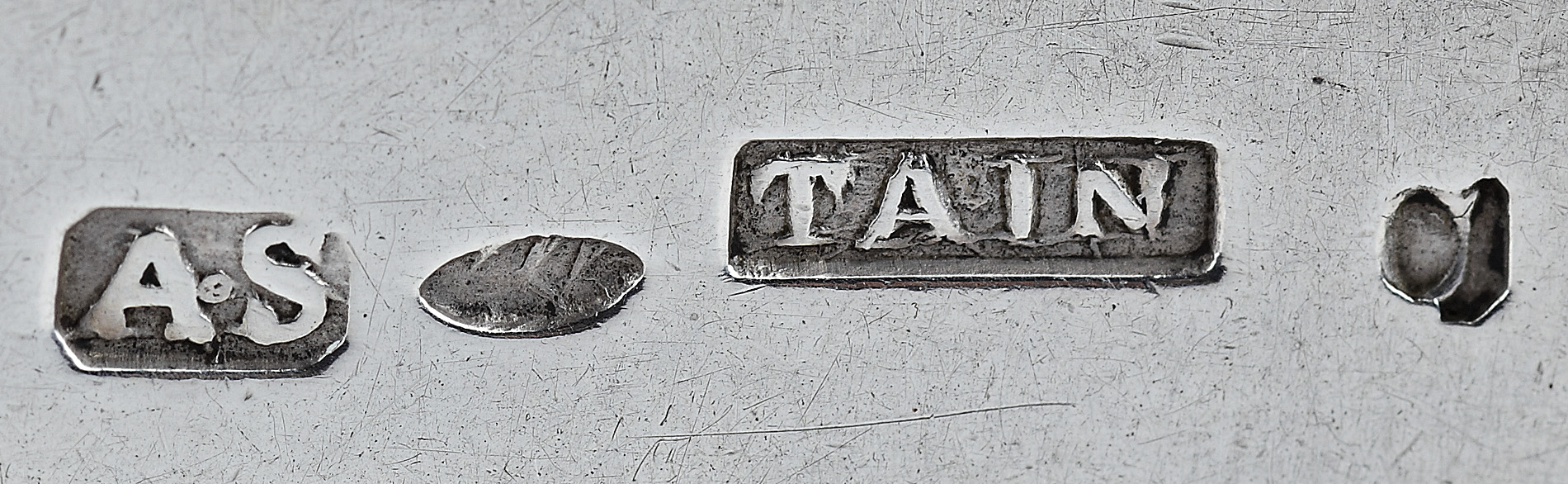 Alexander Stewart, marked A.S, wheat sheaf, TAIN, C, with Fiddle pattern (lacking shoulders), with three tapered prongs