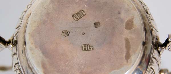 Ker & Dempster, Edinburgh 1748, Assay Master Hugh Gordon, the slight baluster body with chased lower border of foliage and flower heads and engraved with a crest and motto, with twin cast intertwined serpent handles with scroll terminals