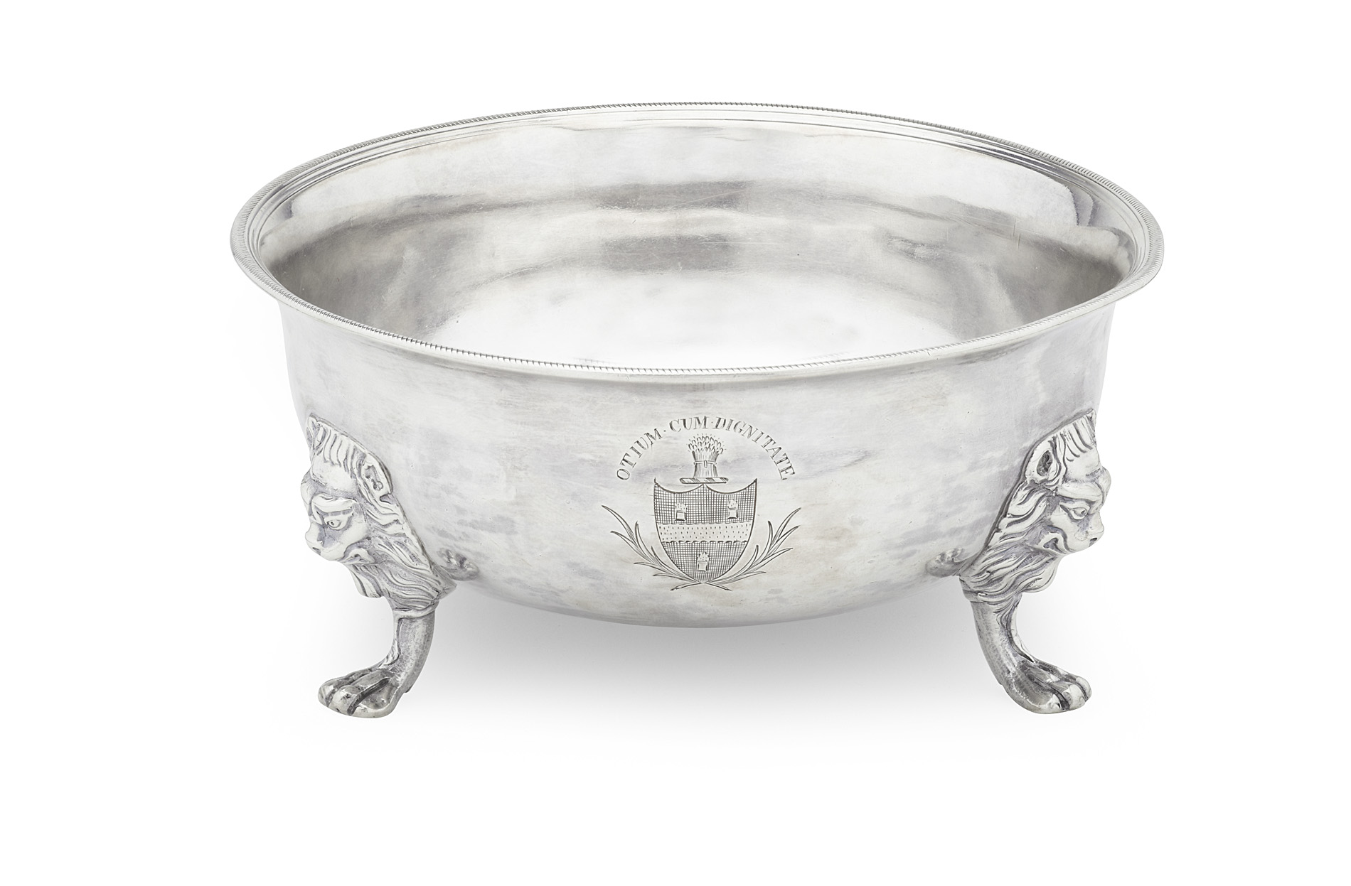 James Kerr, Edinburgh 1726, Assay Master Edward Penman, of slight baluster hemispherical form with everted semi spiralled reeded rim, the body with engraved crest and armorial, raised on three finely cast lion masked paw feet, the underside with scratch weight '11=12'