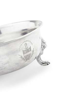 The next recorded example of a Scottish three footed bowl (by James Tait of Edinburgh 1734 - 1735, ex Phoenix Collection Lyon & Turnbull 16th August 2010 lot 294) is of much more standard footed design with the feet and legs mirroring that of the cream / sauce boats of the period, which makes this piece stand out as a far more unusual survival of design.