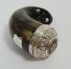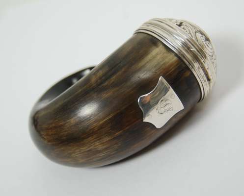 unmarked, the curly horn body with applied shield cartouche with foliate initials 'AS' the domed hinged cover with embossed scrolls and collet set central citrine