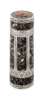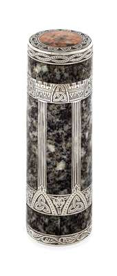 M Rettie & Sons, marked M RETTIE & SONS / ABERDEEN (incuse), the cylindrical bottle with panels of silver granite within engraved Celtic borders, the cover and base with pink granite panels, the hinged cover opening to reveal a glass stopper and gilt interior