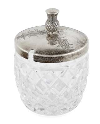 William Robb, marked WR, BLTR, Edinburgh 1912 the tapered cut glass body with pull off slightly domed cover with cast thistle head finial and engraved thistle leaf decoration
