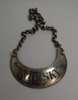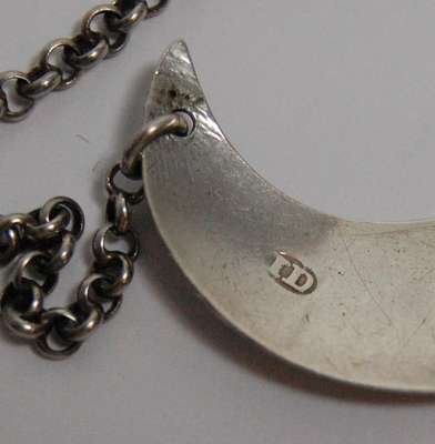 James Douglas, marked ID (in oval) only, of crescent form with toothed border and inscribed 'WHISKY' SUSPENDED from a belcher link chain