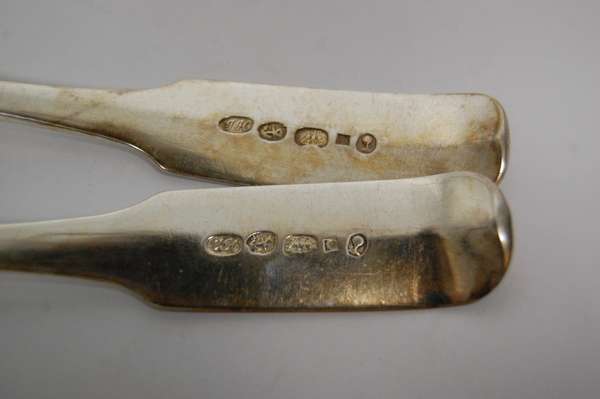 John Heron, marked JH (in script), anchor, ship, C, oak tree, of Fiddle pattern with foliate script initials 'IR' and numbered '2' and '4' to terminals (2)