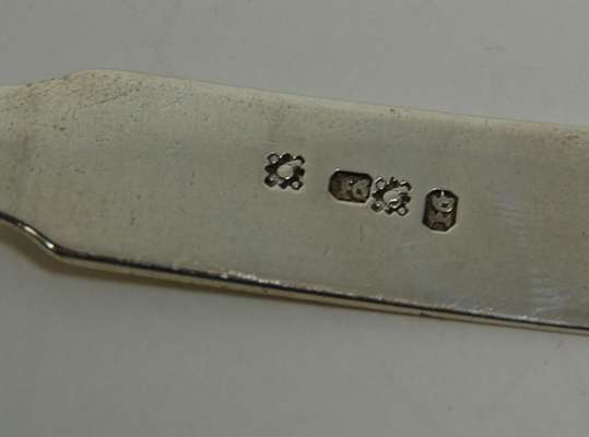 John Glenny, marked flower head, IG, flower head, IG, of Oar pattern with shallow circular bowl and script initials 'LMC' to terminal