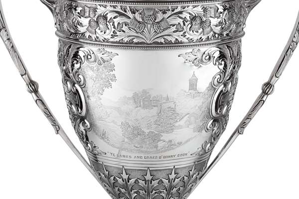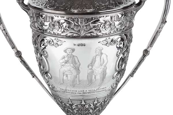 Walker & Hall, Sheffield 1894, the deep tapered vase shaped body with upper border of chased trailing thistles, the main body with twin scroll formed cartouches with finely engraved scene of Alloway and to reverse Tam o Shanter and Souter Johnnie, with foliate displays either side, the lower section with thistle leaves clasping above a waisted stem and spreading thistle chased decoration, with twin acanthus capped slender scroll handles, the pull off cover with thistle leaf gadrooning and surmounted by a rider jumping a fence, the whole raised on an ebonised wooden plinth with applied shield cartouches and presentation plaque reading 'Hurlingham Club Buenos Aires The Aryshire Cup W Samson'