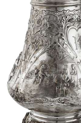 Elkington & Co, Glasgow 1909, comprising water pot, teapot, twin handled sugar bowl and milk jug, each with slight baluster body with chased strap work cartouches with Robert Burns scenes and surrounded by trailing thistles and flowerheads, with shield cartouches to obverse and reverse with monogrammed gothic initials, on a flared quatro foil foot chased with thistle decoration (4)