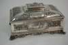 Robert Scott (probably) Glasgow 1902, of rectangular outline with embossed scrolling panels of foliate and thistles with Celtic bosses to centre, the front penal with chased scene of North Woodside Mission hall, raised on four bracket feet and foliate borders, the domed hinged cover with scroll and thistle panels and with raised centre section with monogrammed initials with helmet above, the silk line interior with original presentation scroll and letter