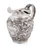 Adam Elder, of tapered form with profusely embossed foliage and scroll to body with scroll formed cartouche with engraved initials FLB within, with everted rim and wide pouring lip, the C scroll strap handle with chased floral decoration