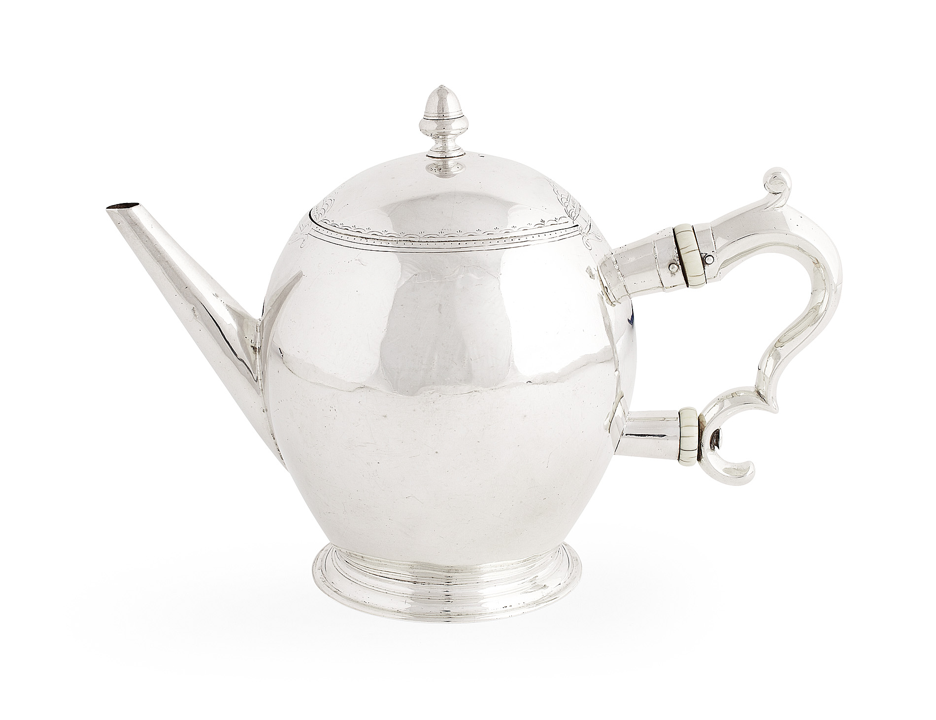 James Mitchelson, Edinburgh 1732, Assay Master Archibald Ure, the body of plain ovoid form with straight spout and bold S scroll handle, the domed hinged cover with delicate flat chased border and decoration to hinge with simple acorn finial, raised on a stepped spool foot