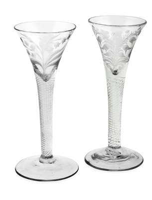 Notes: although the engraved flowers to both these glasses are unusual (not being the typical rose heads and buds), however when compared to a pair within the Drambuie collection it appears possible that these flowers represent an anagram of 'Charles' and a full set of seven glasses spelling it in full.