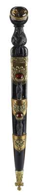 the brass mounts R & H B KIRKWOOD 66 & 68 THISTLE STREET EDINBURGH, the basket weave carved handle with shouldered grip with carved bonnet and crossed swords to obverse and thistle to reverse, the pommel set with thistle mounted collet set foil backed crystal, the leather covered scabbard with applied thistle and regimental badges and set with bi knife and fork