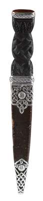 JR, Edinburgh 1883, the carved interlaced handle with collet set crystal to pommel in gadrooned mount, the leather covered scabbard with Celtic interlaced knotwork and bosses to the mounts