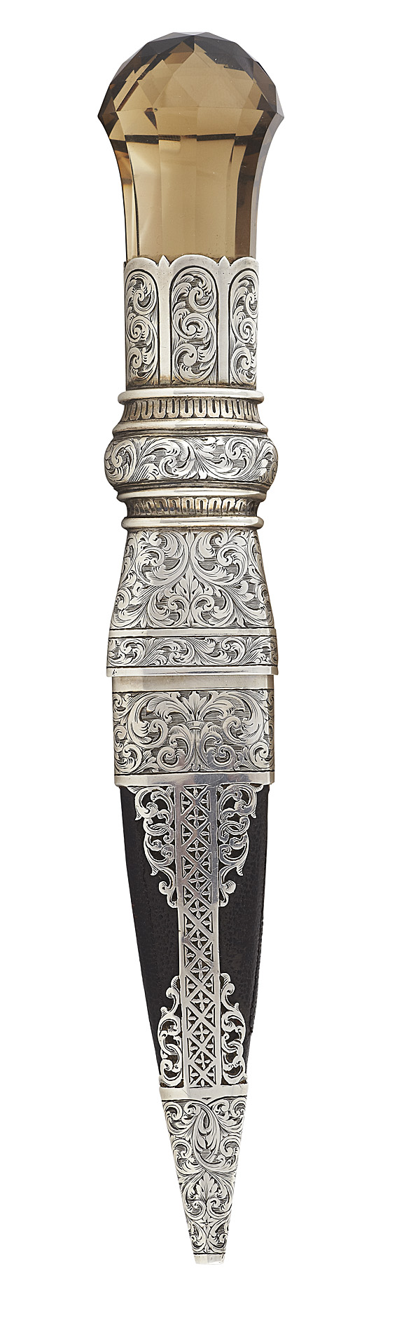 R & H B Kirkwood, Edinburgh 1904, the finely engraved foliate scrolled silver handle with large flared and domed facetted citrine handle, the leather covered scabbard with engraved and pierced floral scroll mounts