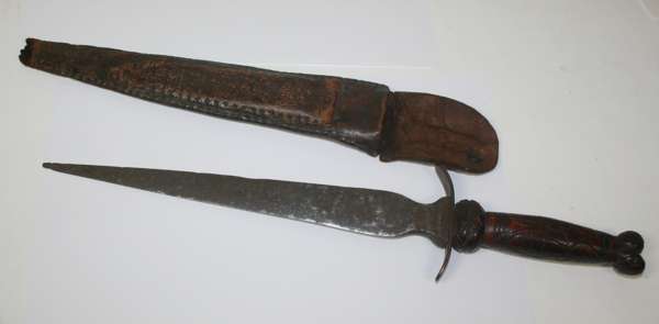 Edinburgh 1868, mounts all with stylized thistles and engraved with the Royal Arms; together with a dagger with a carved wood grip, bifurcated pommel, corroded double edge blade in leather sheath
