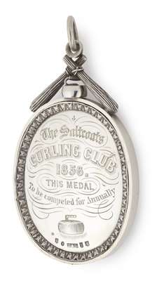 T&D, Glasgow 1856, of oval outline with acanthus border, crossed brooms and curling stone suspension, the obverse engraved 'The Saltcoats Curling Club 1856, this medal to be competed for annually' with curling stone below, the reverse blank. contained in the original fitted case