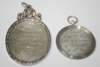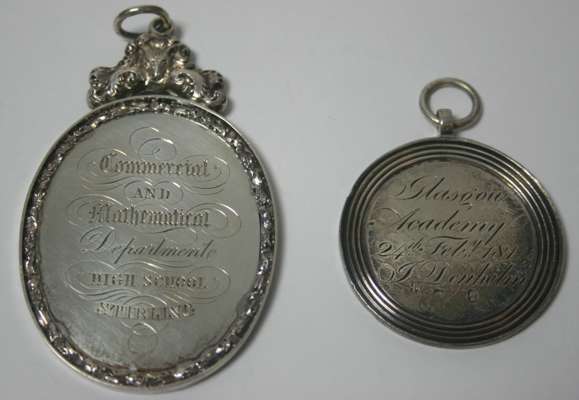 unmarked, of oval outline with cast suspender inscribed to obverse 'Commercial and Mathematical Department High School Stirling' and to reverse 'First Prize for Penmanship awarded to David Cathcart 28th June 1860'; together with a smaller circular example by Robert Gray & Sons of Glasgow, engraved to obverse 'Glasgow Academy 24th Feby 1814 J Denholm' and to reverse 'Given as the 1st prize at the end of a course to Mr Rt Lamb' (2)