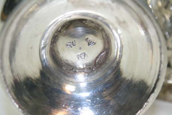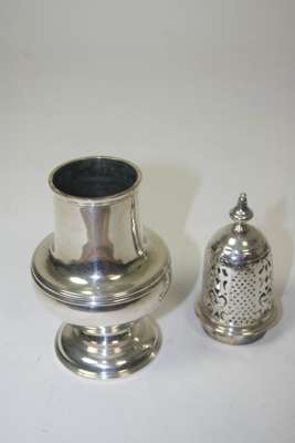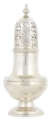 Edinburgh 1761 (maker's mark lacking), of plain baluster form, moulded girdle, the pull off domed cover with pierced panels and urn finial