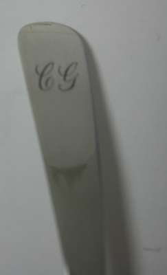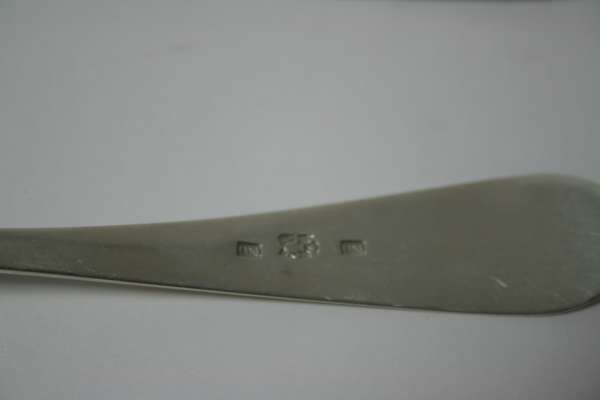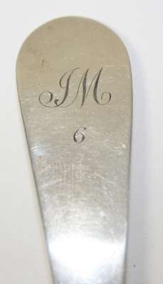 David Manson, marked DM, pot of lilies, DM, of Old English pattern with initials 'JM' and numbered '6' to terminal; together with two toddy ladles by L Beech, Edinburgh 1806 (3)