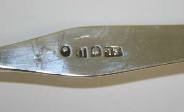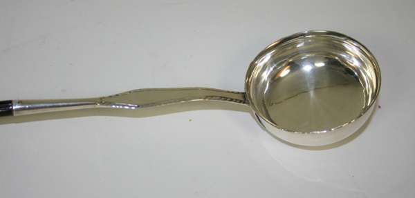 Edward Livingstone, marked EL, heart, D, crowned heart, the circular bowl with flat stem, feather edged details, socket attached to part twisted baleen handle with plain cap