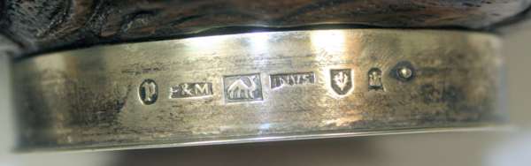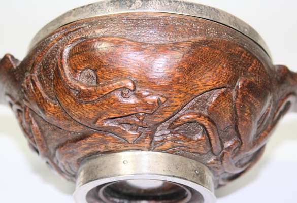 Ferguson & MacBean, marked to rim and foot, F&M, camel, INVSS, Edinburgh 1897, the deep bowl carved with mythical Celtic beasts and with twin shaped lugs formed as intertwined serpents, with simple collar rim and foot, the centre of the bowl with domed boss engraved 'Sguab as'i'
