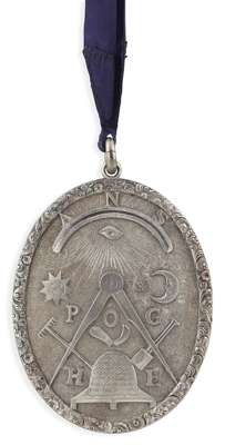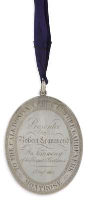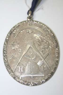 unmarked, the obverse with foliate border surrounding various symbols including calipers, spade, rake sun and moon and bee hive, the reverse engraved 'TO THE CALEDONIAN LODGE OF FREE GARDENERS*MONTROSE*' around 'Presented by Robert CRAMMOND in testimony of his respect & gratitude 1st August 1861'