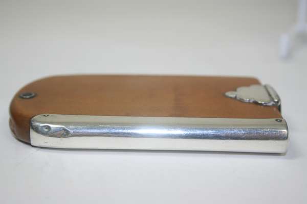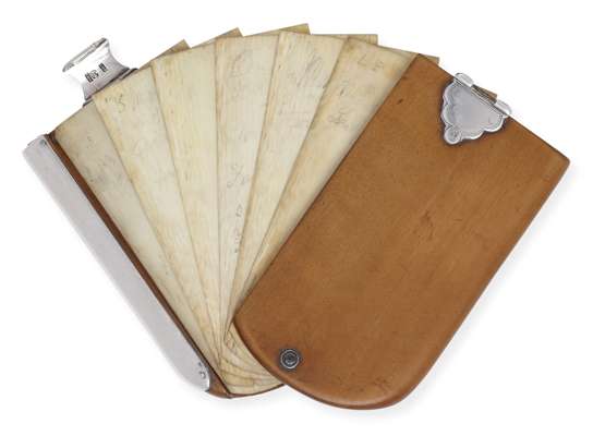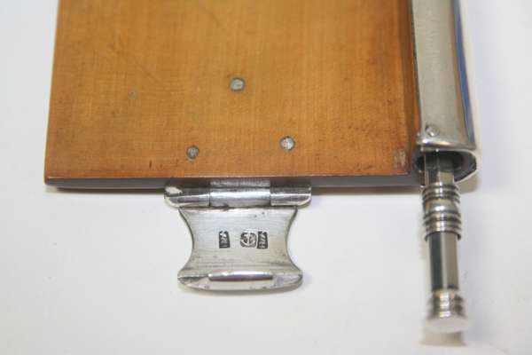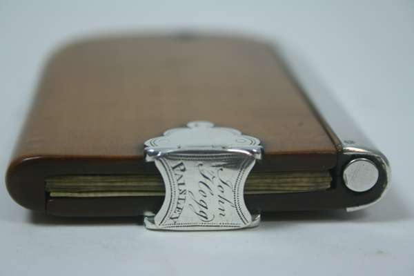 William Hannay, marked to clasp WH, anchor, WH, the rounded rectangular sycamore covers with hinged action revealing six ivory pages, the simple hinged silver clasp engraved 'James Hogg Paisley', scalloped mounts, the rounded edge with applied silver spine and recessed pencil