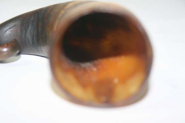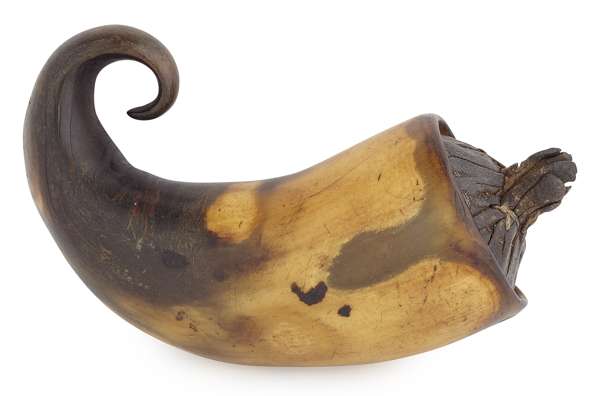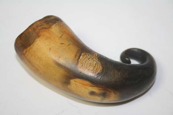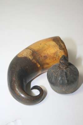 the horn body with simple curled terminal, with a pull out lid formed from a section of leather covered cork