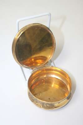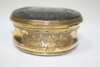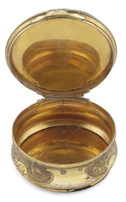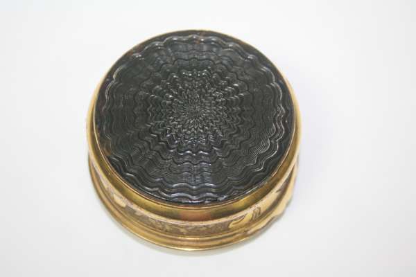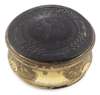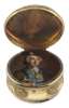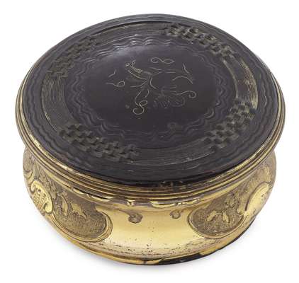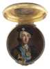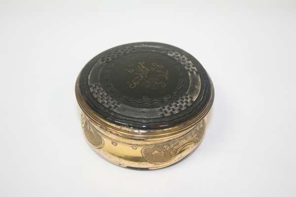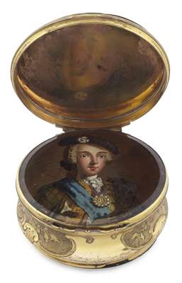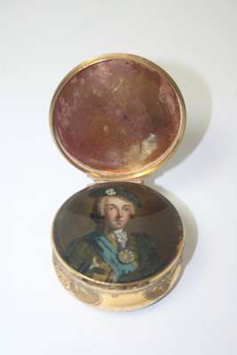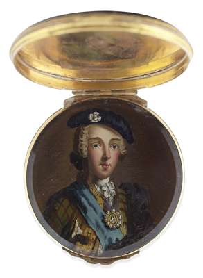 of circular outline, the interior of the false upper lid painted in reverse on glass with a portrait of Bonnie Prince Charlie in highland dress, the side chased with vignettes of flowers and foliage, the base and lid of turned patterned tortoiseshell inlaid with pique decoration of bird on a stem, the base finely turned in the form of a rosette