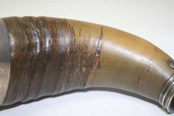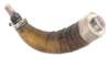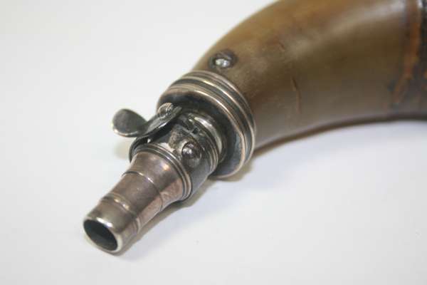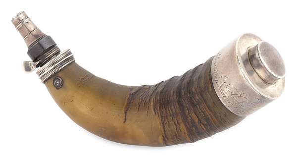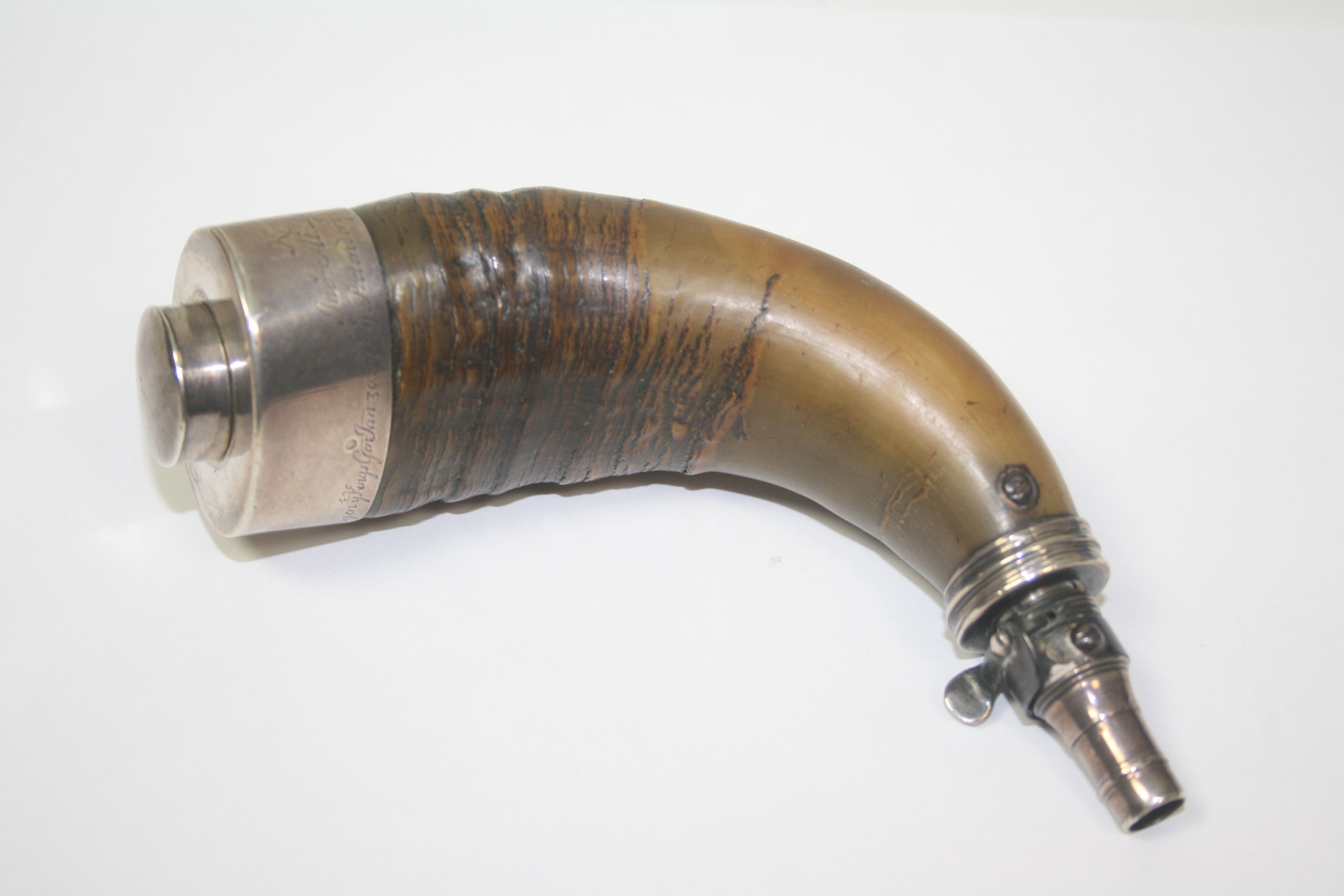 A rare early 18th century silver-mounted pocket ram's horn powder flask