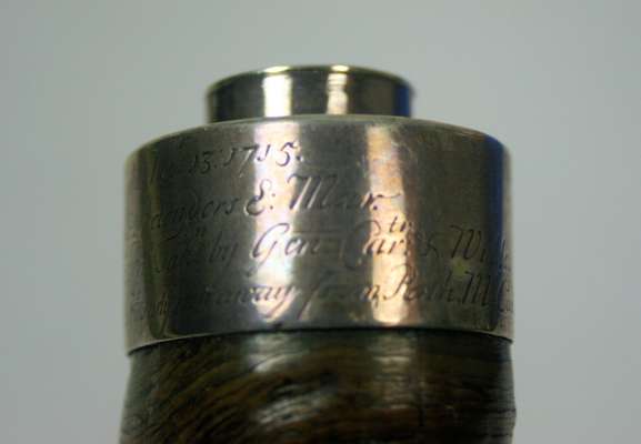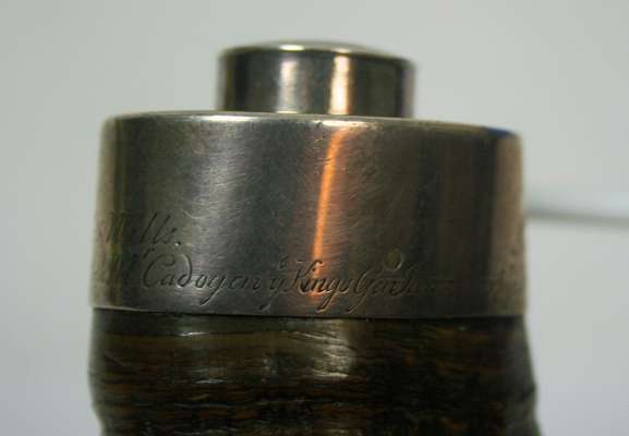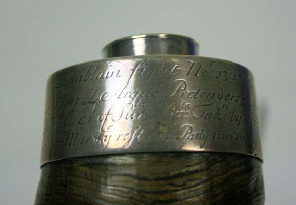 with an engraved inscription on the base 'Dunblain fight Nov. 13th 1715 Kings Gen: D Argile. Prenders & Mar Inv:At:Def: by Erl of Sur lnd: Prs:in: Takn: by Gen: Cartr: & Wills Pretender: Erl: Mar & ye rest of ye Party run away from Perth. M. Cadogen Yr Kings Gen. Jan 30th1715/6', the silver nozzle and turned mount decorated with incised line turning, secured by two screws, the base with screw top silver cap
