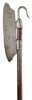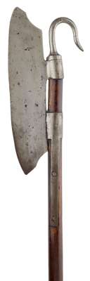 of characteristic form, the broad blade with slightly convex cutting edge clipped-in about and below, integral circular socket mounts, the upper one surmounted by a re-curved hook of tapering circular section, the lower one with integral side-straps riveted to the original wooden shaft of circular section, and conical iron shoe with compressed globular terminal