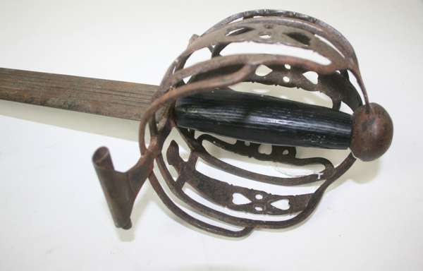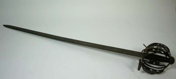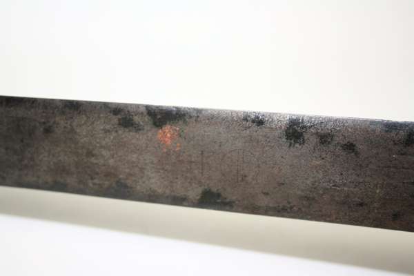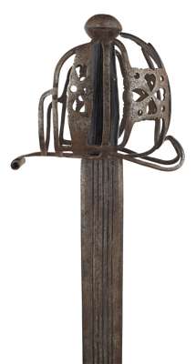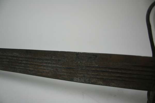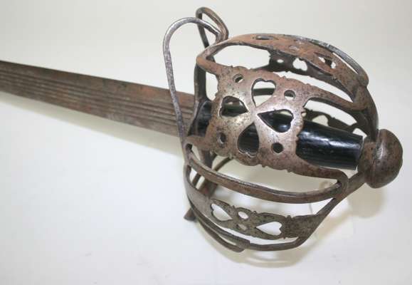 circa 1760, the large guard of flat section bars in conventional pattern with pierced hearts to each side of the hilt, the wide wrist guard with wooden grip, with a small bun shaped pommel, the double edged blade with five long fullers running for 26cm from the ricasso, struck on both sides with an orb and cross