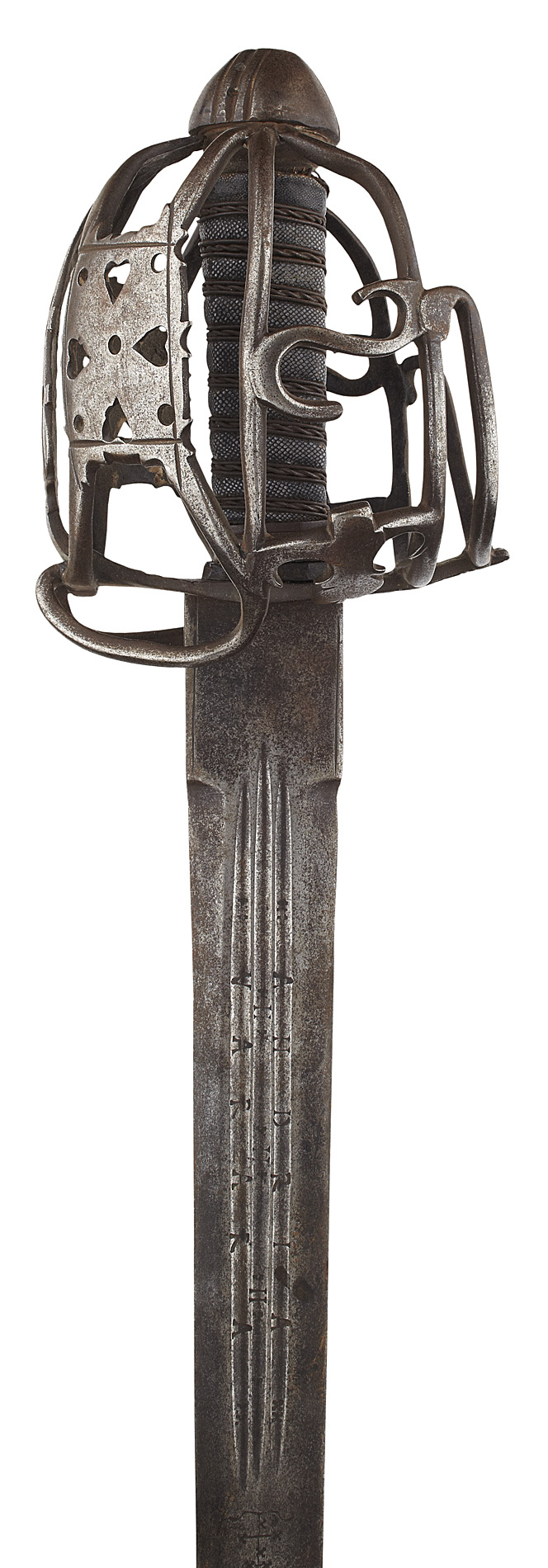 circa 1700, the guard of round section bars in conventional pattern with 'S' patterns to each side of the hilt, the ray skin bound grip with a double twist of silver wire, the double edged blade with three short fullers struck with the name 'ANDRIA VARARA'
