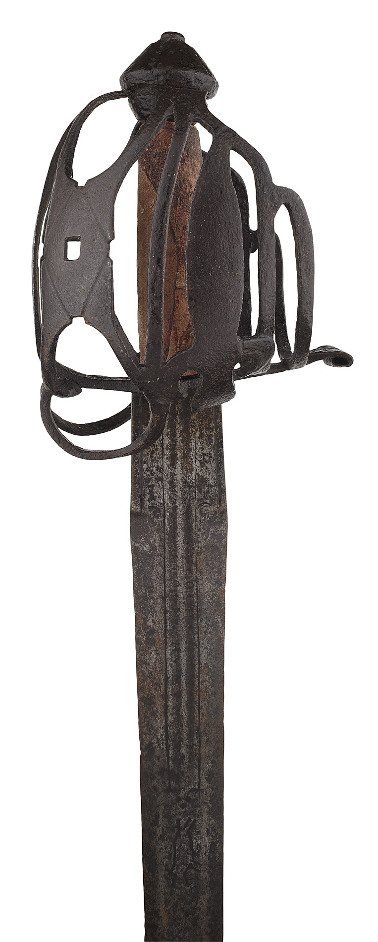 the large guard of flat section bars in a rare pattern with pierced squares to each side of the hilt, short wrist guard, large conical shaped pommel, double edged German blade with two-short fullers and struck with I O H N ? an orb and running wolf marks