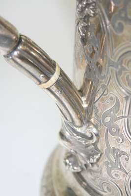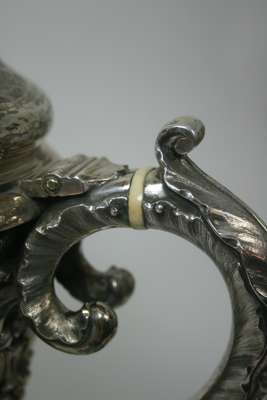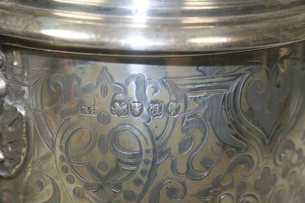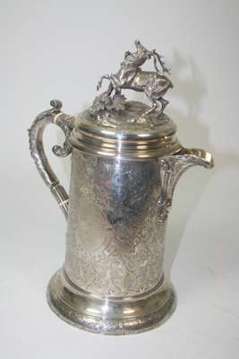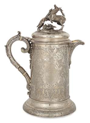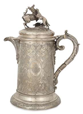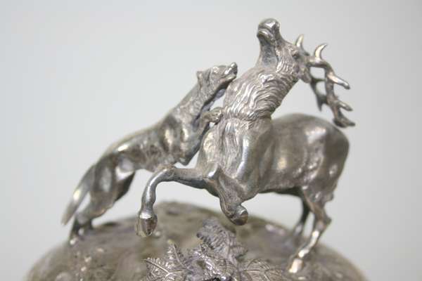 Robert Hennell, London 1855, the cylindrical body with profusely engraved decoration, and presentation inscription, the hinged cover with fighting stag and hound finial