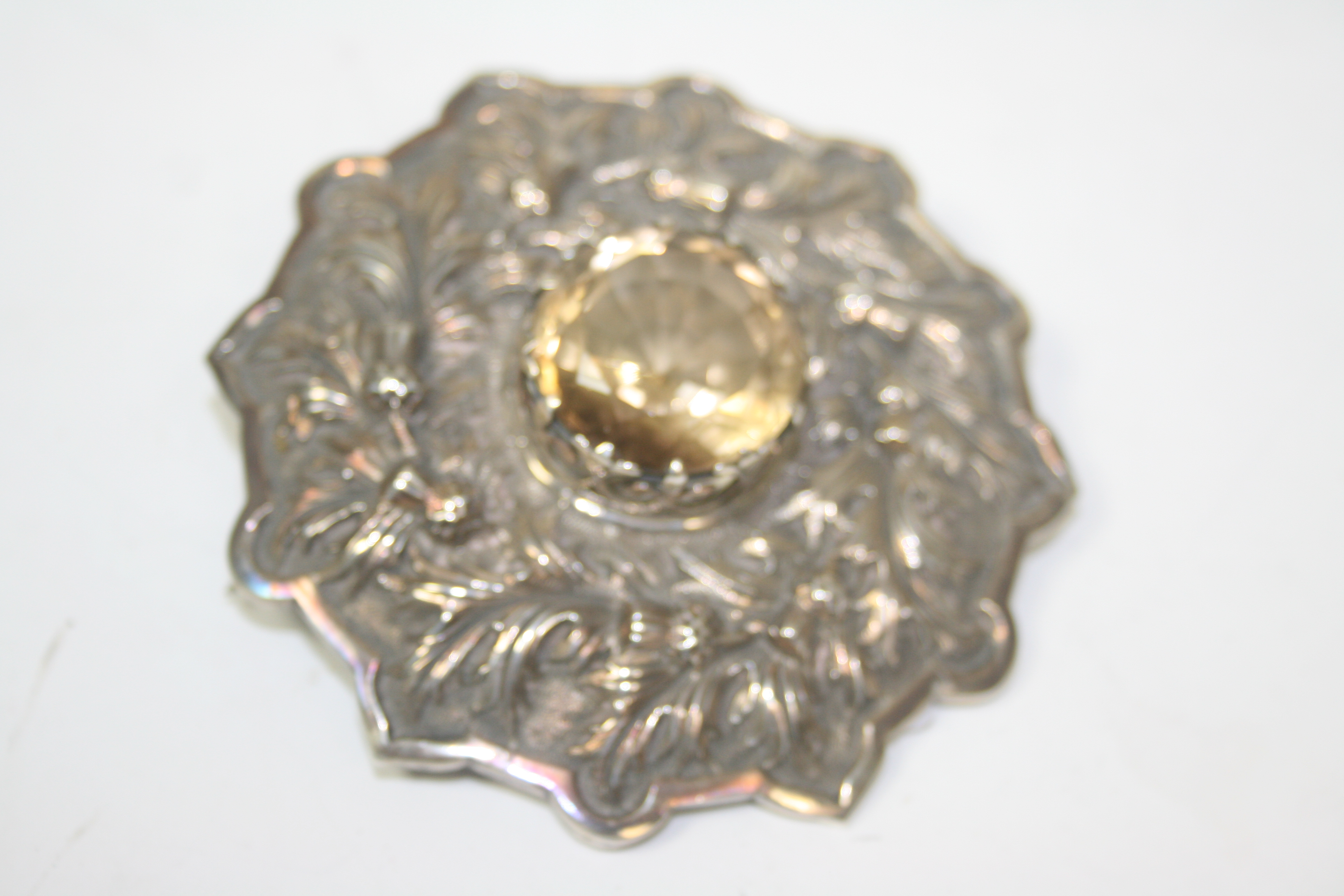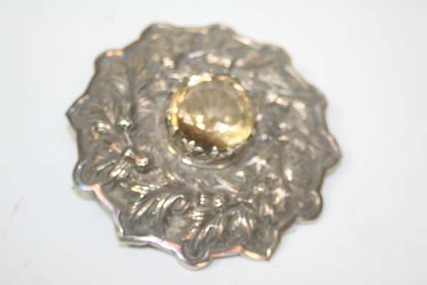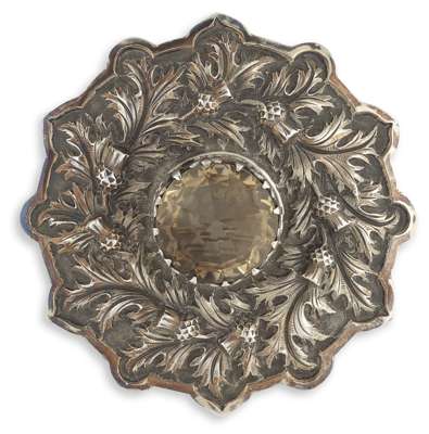 J Duncan, Edinburgh 1898, of shaped circular outline with embossed thistles and centrally set facetted citrine