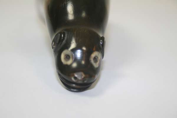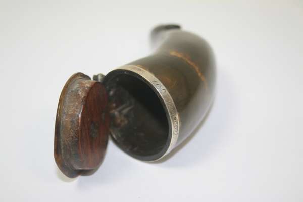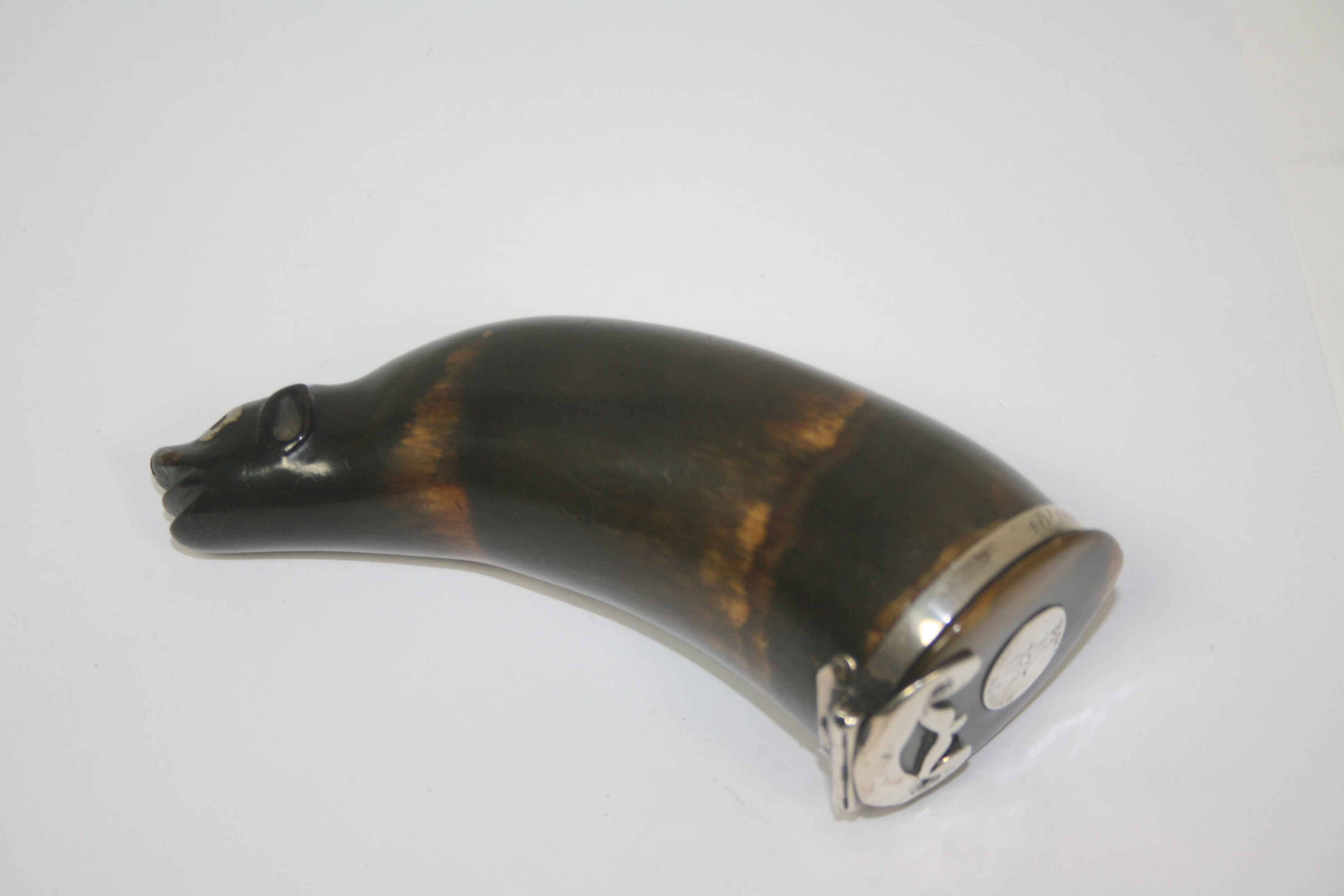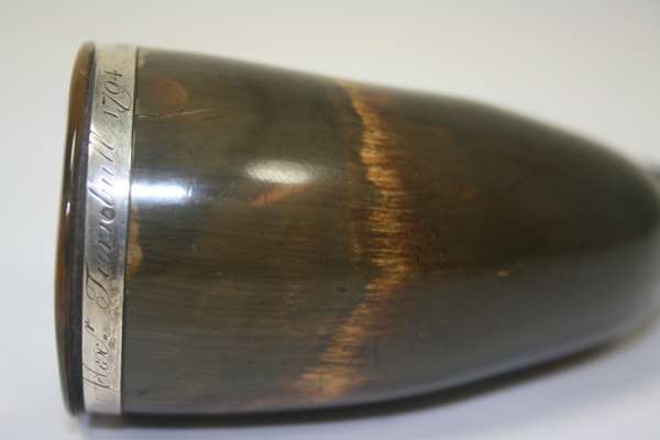 the cow horn point with carved figural terminal with inset eyes, the collar mount engraved 'Alexr Turnbull 1794' with butterfly hinge and plaque with crest and motto to horn cover