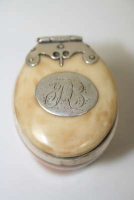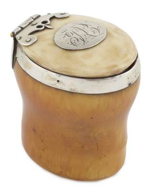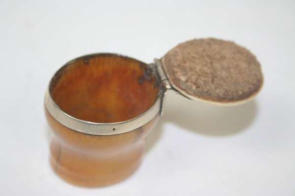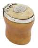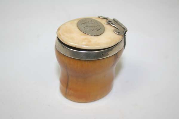 of baluster form with simple collar and butterfly hinge to ivory cover, with central set cartouche with engraved initials
