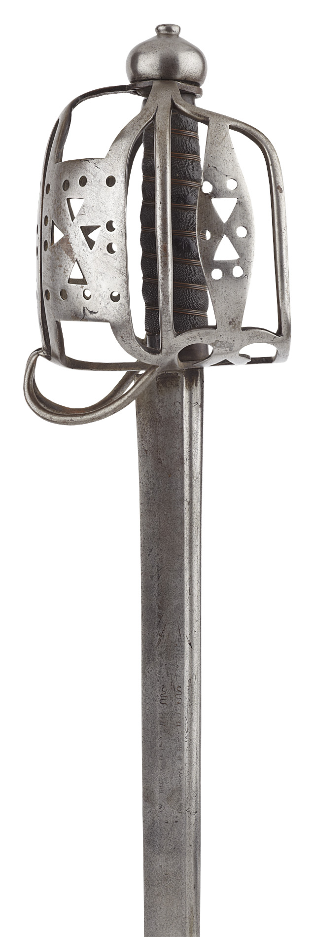 with cut away hilt of horseman's type, formed with pierced triangles and holes on each plate, bun shaped pommel, the grip bound with dogfish skin, single edge blade signed on back edge SOLINGEN .