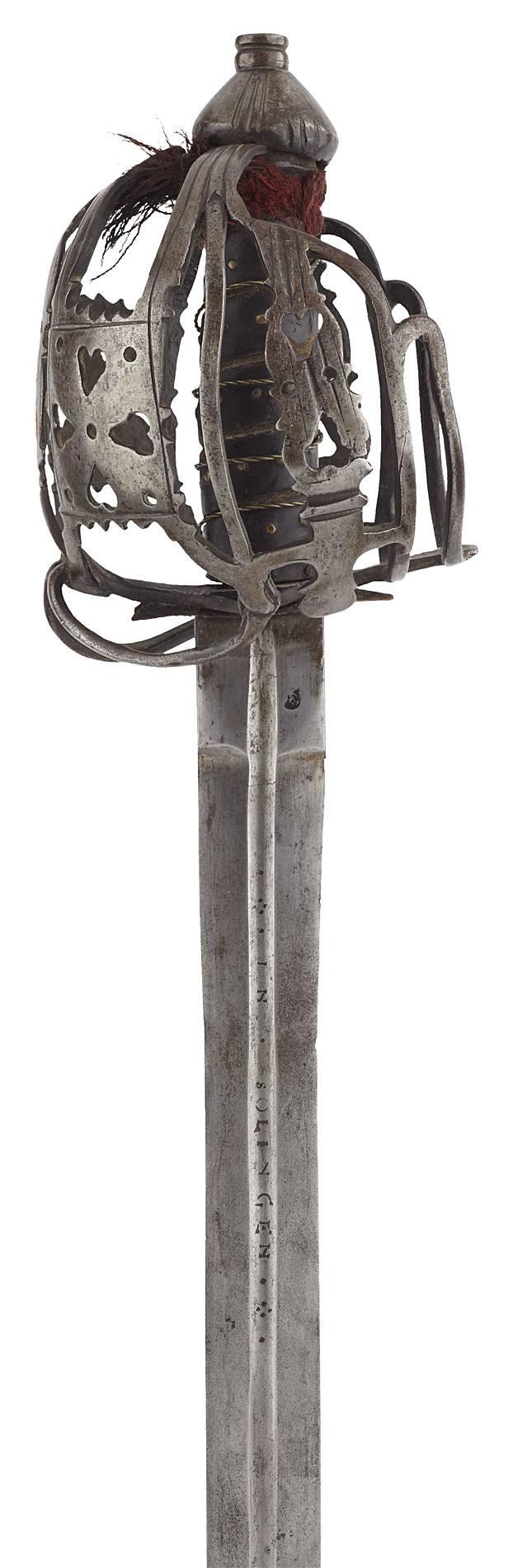 the basket formed of round section bars cut with grooves, the side guards with hearts pierced on each plate, large asymmetrical basket with missing wrist guard, the pommel cut with grooves the wooden grip bound with black leather, and loose brass wire the blade struck in the fuller CLEMENT BRACH XXIN SOLINGEN and with an armourer's mark.