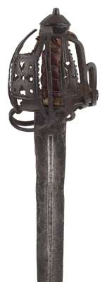 the basket formed of flat section bars with centre grooves, traces of old Japanned decoration, side guards with hearts pierced on each plate, 'A' struck at the wrist guard, the pommel cut with grooves the wooden grip bound with leather and a twist of silver wire, replacement ferules and grip, the blade with single short fuller, struck Andrea and Ferara.