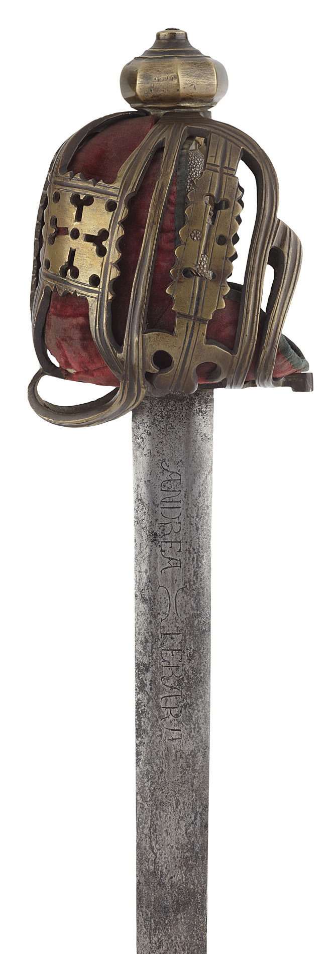the brass basket formed of flat section bars with central grooves, hearts pierced on each plate, the pommel of octagonal form, the original wooden grip bound with white ray skin and with a double twist of brass wire the blade struck with ANDREA FERARA in script