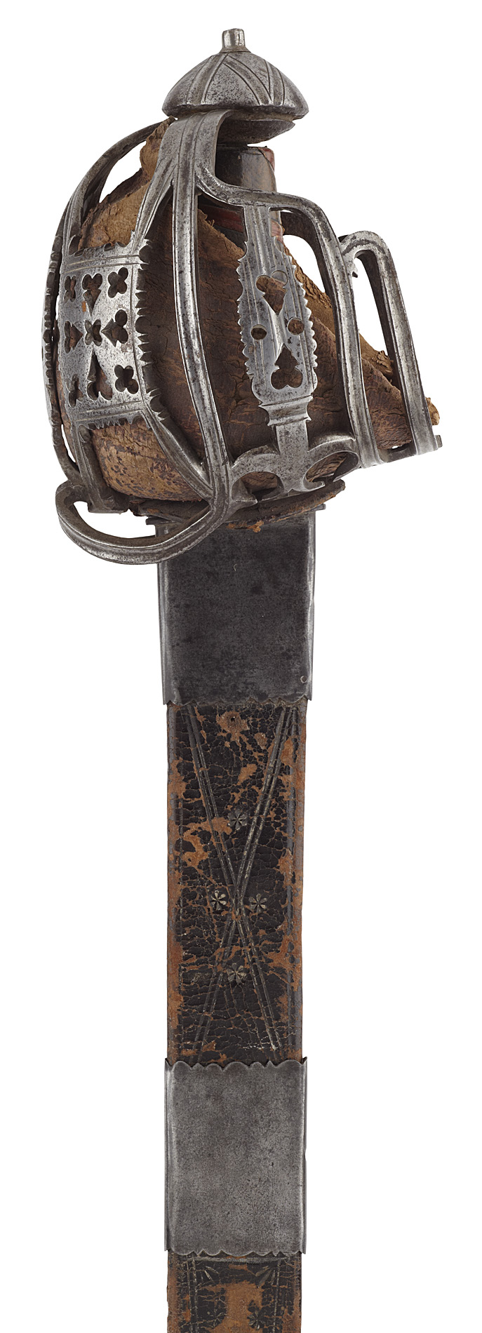 the basket formed of flat section bars with centre grooves, the side guards with hearts pierced on each plate, missing wrist guard, the pommel cut with grooves, the wooden grip bound with leather, original liner, the blade with running wolf mark with original scabbard