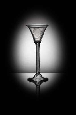 the trumpet bowl above a moulded wrythen stem and spreading foot, the bowl engraved with displayed rose head, intertwined buds, star and oak leaf, inscribed 'Fiat'