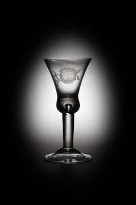 the knopped trumpet bowl above slightly tapered stem and spreading foot with folded rim, the bowl engraved with a sunflower and displayed bird
