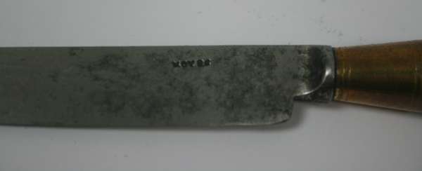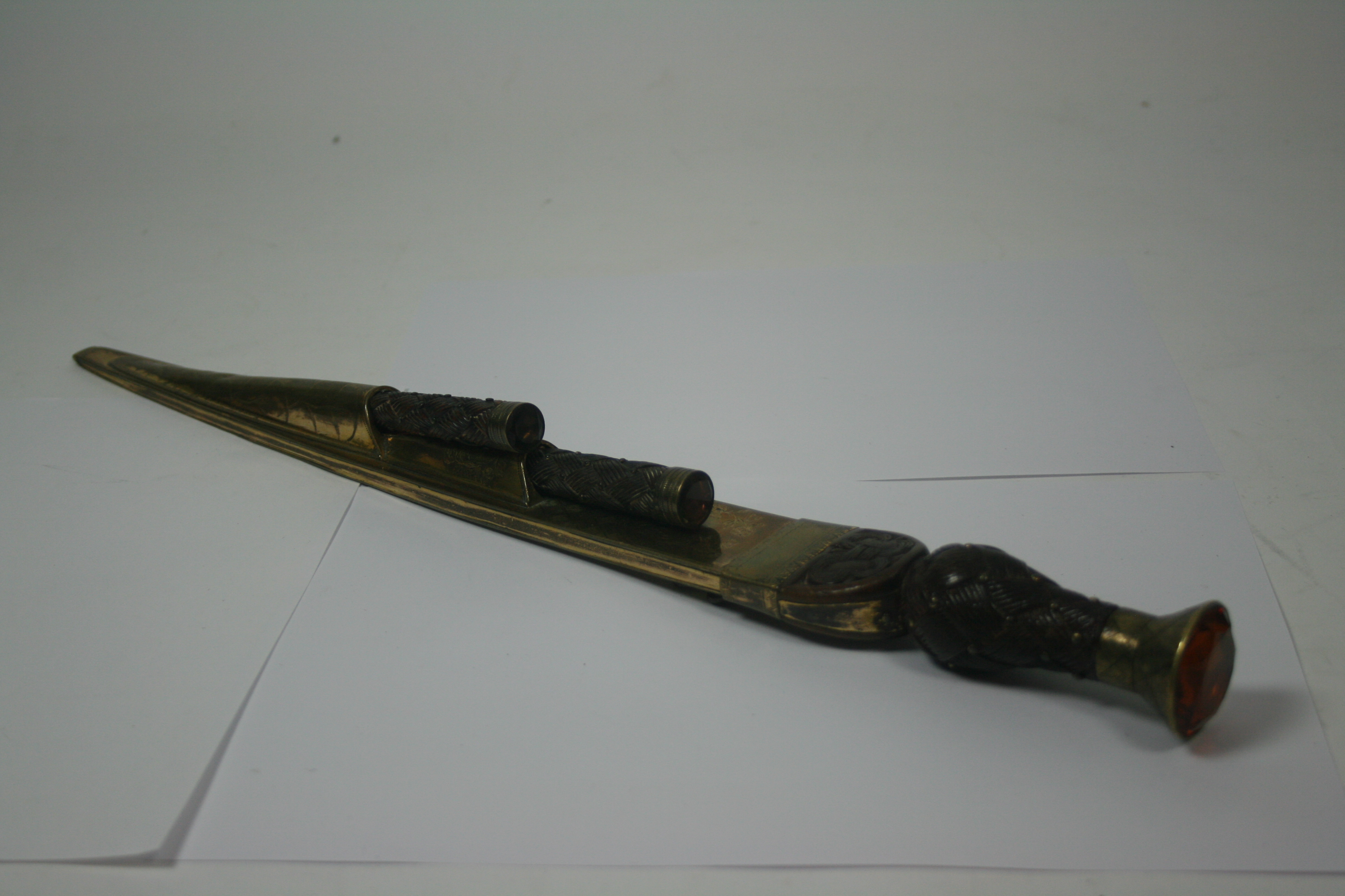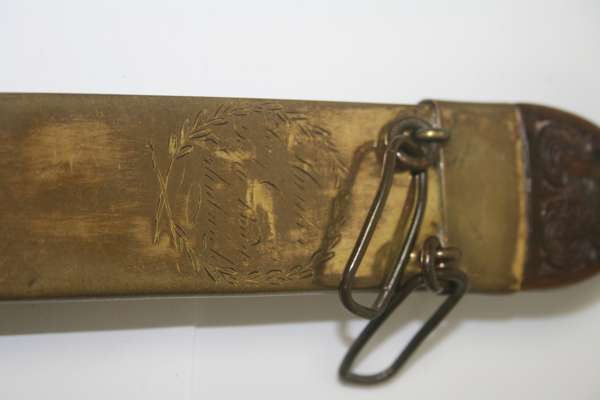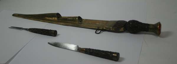 interlaced root wood grip studded with brass at intersections, brass pommel mounted with faceted stone, single edged etched blade with wide central fuller and Royal crown, back edge decorated with alternating grooves, gilt brass shaped and moulded scabbard with bi knife and two pronged fork, engraved "Hunter Army Contractor South Bridge Edinburgh" within laurel leaves