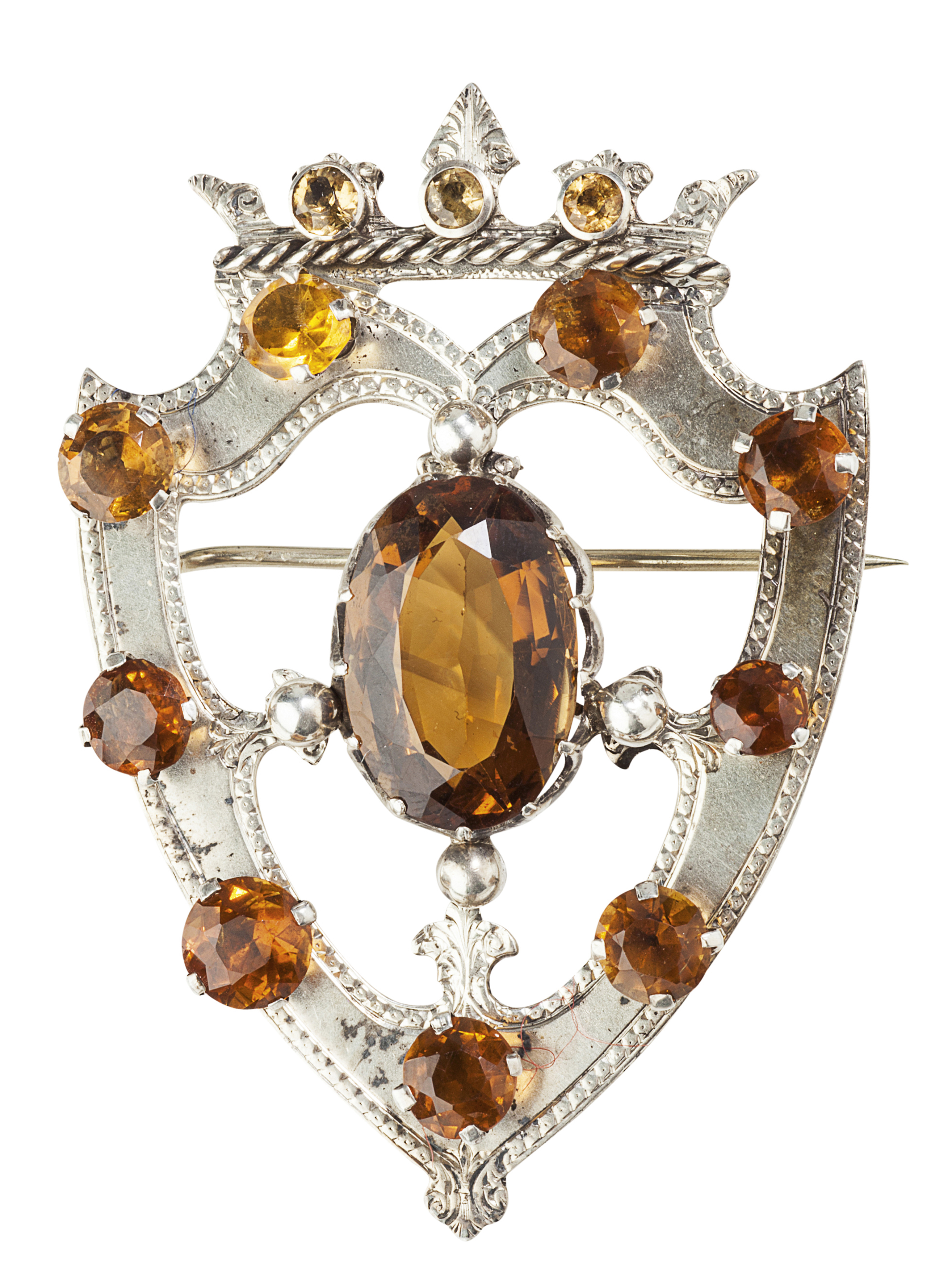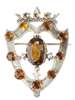 unmarked, set in silver of open heart shape with crown surmounting, with applied claw set citrines to borders and centre